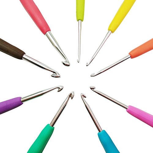 9 ERGONOMIC CROCHET HOOKS - Lightweight silicone comfort grips will help reduce hand fatigue and irritation enabling longer hours of crocheting - Color coded handles for easier identification - Aluminium hooks are made with a smooth finish meaning less pinching, pulling & tugging - Sizes range from 2.0 - 6.0 mm (B-J - conversion chart included)