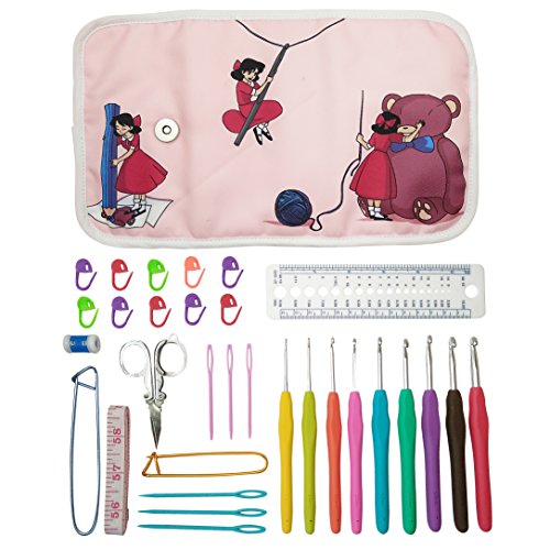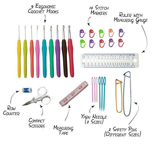 ACCESSORIES - Everything needed to get started with your first crocheting work, making it the perfect starter pack - 2 large aluminum safety pins, measuring tape, 10 stitch markers, row counter, compact scissors, 6 yarn needles (2 sizes), ruler with measuring gauge and crochet hook conversion chart