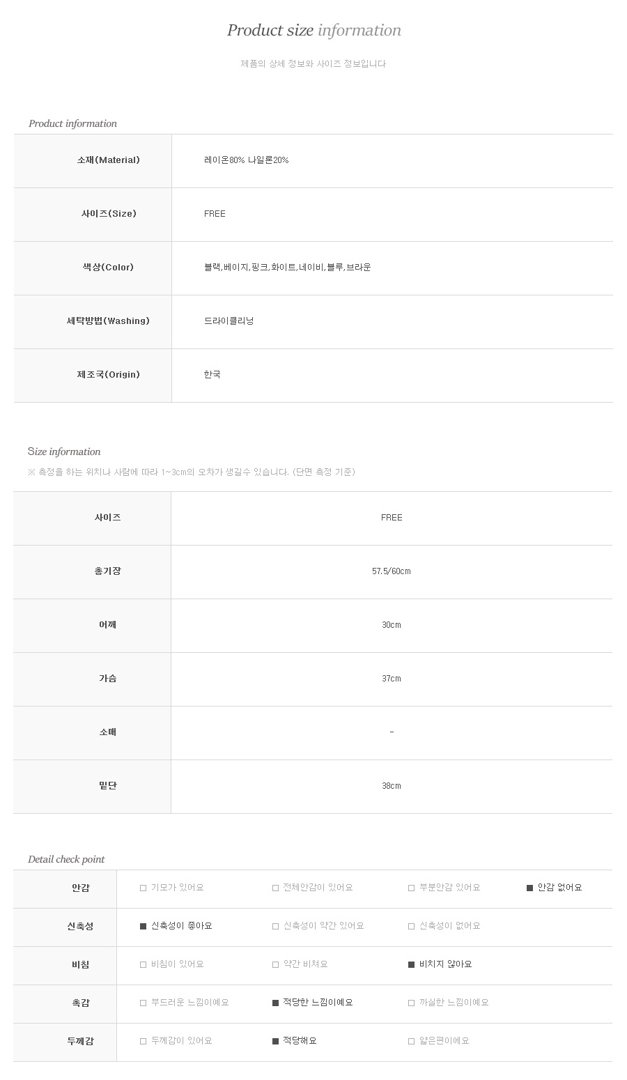 사이즈는 프리 사이즈로 44~66까지 예쁘게 착용 가능하세요 개인의 체형에 따라 핏이나 기장이 달라질 수 있으니 사이즈표를 참고 해주세요