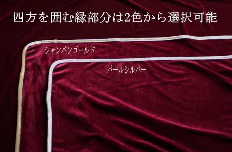 縁部分のカラーは「シャンパンゴールド」「パールシルバー」の2色をご用意しています。サイズはワイドな90cm超となりまして、多くのテーブルで使用可能です。※事前にご使用になられるテーブルとサイズ確認をお願い致します。