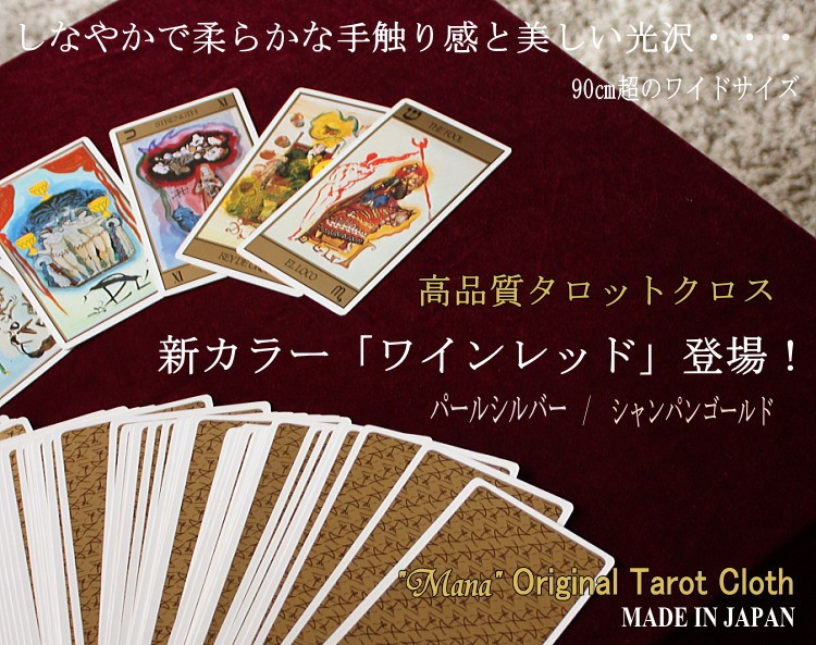 ☆ワインレッドカラー再入荷!☆品質・高級感ともにバッチリ!ロイヤル気分に浸れる王道のタロットクロスで、気品ある正統派のタロットリーダーに!Mana オリジナル・プレーン(無地)・タロットクロス■カラー:ワインレッド ※無地(柄なし)■縁:「ゴールド」 or 「シルバー」※縁を取り囲むテープとテープの結合部は、重ねての処理となりますので若干の膨らみが生じています。■寸法:94cm×94cm ※元生地を効率よくカットして商品化しておりまして、1~2cm程度、サイズが異なる場合がございます。■素材:ベロア(ポリエステル)■生産国:日本 ※タロットクロスだけの供給となりまして、一緒に写っているカード等は付属となりません。