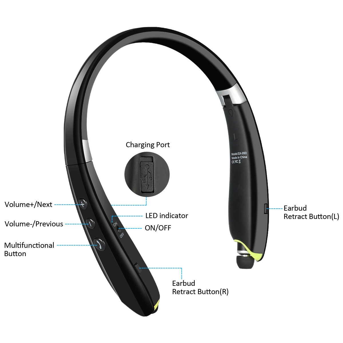 Off / On, Volume + / To Next Music, Volume - / to Previous Music, Charging Port, Earphone Cord Expansion / Shrink Button (Left and Right)