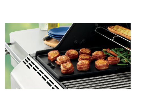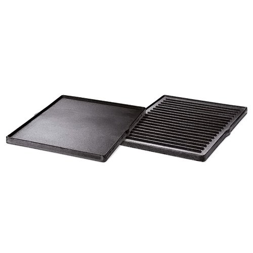 The Weber two-sided cast iron griddle allows you to make pancakes, eggs, and bacon on the smooth side, and use the textured side for delicate fish and veggies.