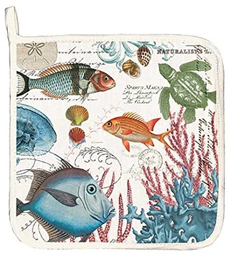 - Potholder with design on front and quilted back side to match the front trim; measures 9 inches square