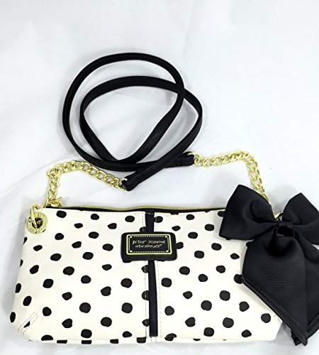 -. Brand : Betsey Johnson -. Color : white -. Department : womens -. EAN : 0889487006985 -. Feature : Gold chain accent / Interior multi function pockets too / Bow accent / Top Zip / Measures 10 inches long and 6 inches high -. ProductGroup : Shoes -. ProductTypeName : HANDBAG -. Title : Betsey Johnson E/W Mini Crossbody White Dot -. UPC : 889487006985