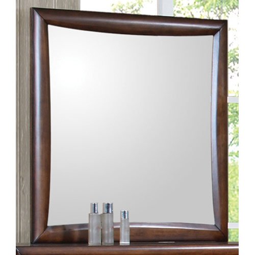- The smooth wood frame has a soft curved look, around the sleek square mirror glass