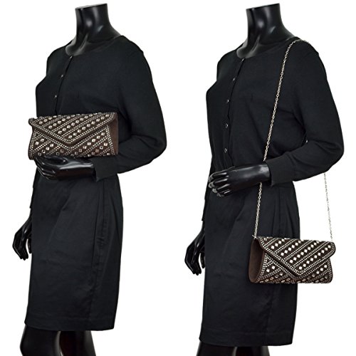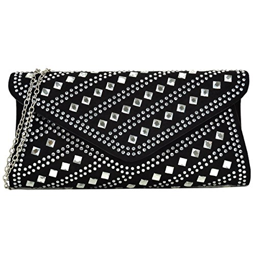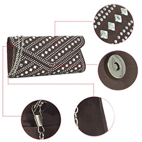 - DESIGN: smooth velvety clutch, decorated with rhinestones and studs, and with flap top magnetic closure, mix of detailed embellishment, and silver chain shoulder strap. edgy yet elegant.