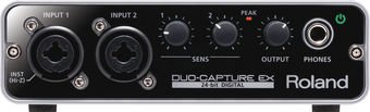 Studio : Roland Publisher : Roland Product Description The compact Roland Duo-Capture EX is ideal for home studio and musicians on the go. You'll love the pristine audio that you get from Roland's acclaimed VS preamps. Housed in a rugged aluminum case, the Duo-Capture EX can be used with Mac and PC computers, as well as the iPad. That's right, now you can get quality 24-bit/48kHz digital audio into your iOS device. Record audio to your favorite apps or use the MIDI inputs to connect a keyboard or digital drums to control virtual instruments. The small and powerful Roland Duo-Capture EX is the perfect USB interface for today's mobile musicians. 0