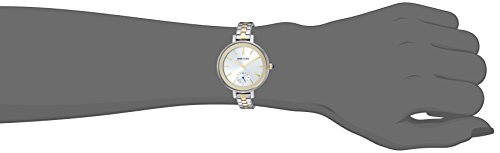 Wall-to-wall mineral crystal lens; silver-tone sunray dial with gold-tone hands and markers; remote second sweep at 6