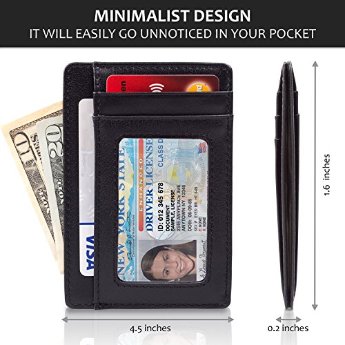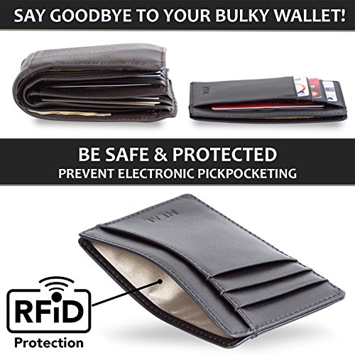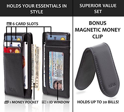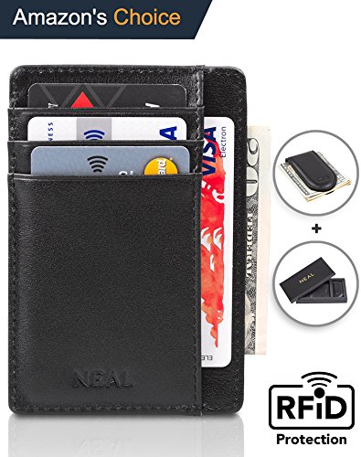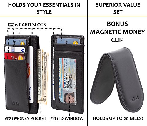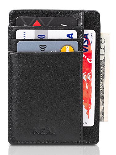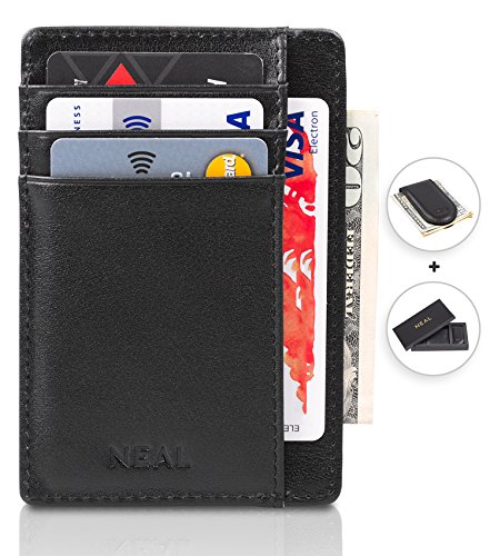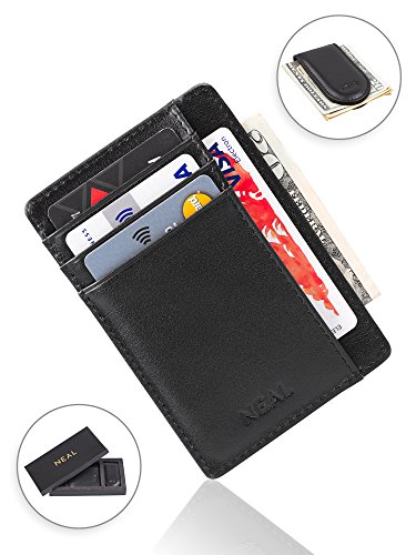 Tired of carrying a bulging wallet with you? Paying with cards is now the convenient way, while cash has become optional. A recent study indicates that 9% of Americans carry no cash at all, while the majority carries no more than $50! That being said, we have created the sleekest way to deposit your capital, NEAL's Credit Card Wallet! Elegant in its simplicity, this leather accessory has been expertly made from flawless black leather to keep your finances in stylish shape. The only distinguishing element is a subtle designer stamp, which minimalists will appreciate. It's handsome presentation box makes it a thoughtful present idea for father's day, a friend's birthday or other significant occasions. This package comes also with a major bonus, a Magnetic Leather Money Clip for securing up to 20 bills. Ideal for when you only need to carry the essentials, the wallet has 6 card slots, a central compartment designed for stashing cash or receipts, and an ID Window with a clear finger glide, making it easy to quickly take in and out your ID card. While it offers plenty of space, our billfold maintains its slim silhouette, so it won't disrupt the line of your pants. Even if you decide to carry it in the back pocket, it's thin design will save you from the back problems that can occur. Marrying function and craftsmanship, this minimalist cardholder is equipped with RFID blocking silver lining to will protect your money and data against any attempt of electronic pickpocketing. NEAL Wallets are great for carrying your business cards as well. Nothing is more classy than taking your business card out of a nice leather card case! Love it or get your money back - 100% Satisfaction Guarantee! We want to provide the best customer experience by offering top quality products and services. If you are not satisfied, we will completely refund your order or offer you a new one with no extra charge./p> 0