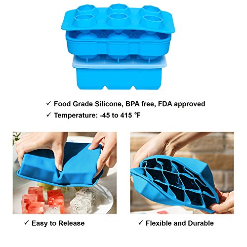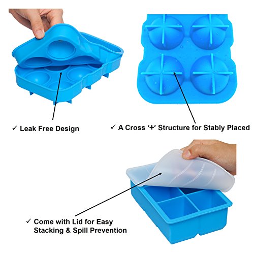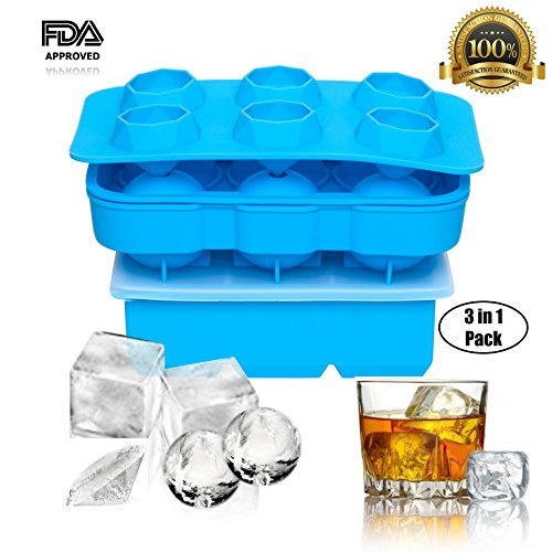Ice Cube Tray and Ice Ball Mold for Making Ice Cube and Balls for Whiskey, Food Grade Silicone Cube and Sphere Ice Maker Mold Tray (Set of 3 - Light Blue)