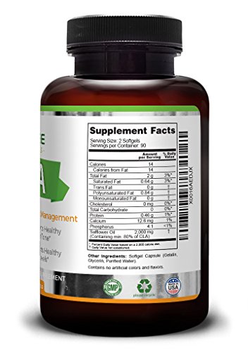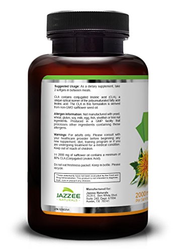 -. Feature : HEALTHY WEIGHT MANAGEMENT: Keep the muscle, lose the fat! CLA by Jazzee Naturals promotes healthy fat loss by increasing your body's metabolism without added stimulants. / SUPER-SIZED DOSAGE, SUPER VALUE: Each serving is 2000 mg, and each bottle contains 180 softgels - a 3-month supply! / FROM NON-GMO SAFFLOWER OIL: Our CLA is derived from non-GMO, all natural safflower seed oil. / CHOLESTEROL AND IMMUNE SYSTEM SUPPORT: Studies have shown that CLA lowers cholesterol in men and women and helps to control triglyceride levels. As an added boost, studies have also shown that CLA supports a healthy immune system! / GOLD STANDARD PRODUCTION: Your health and safety mean everything to us. For that reason, our CLA is manufactured in the USA, in an FDA certified facility with adherence to good manufacturing policies and under the most stringent quality control. You can rest assured that you get the best value for your money!