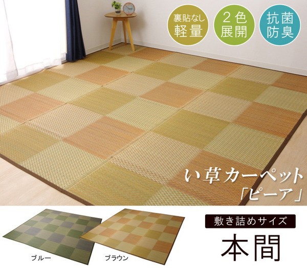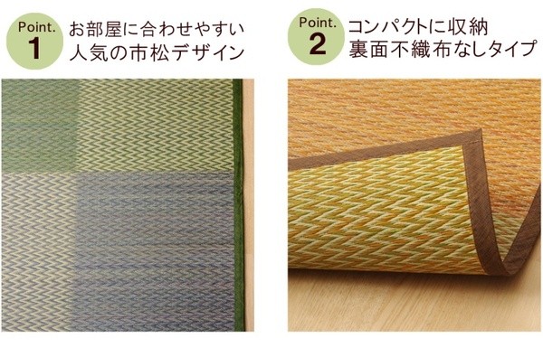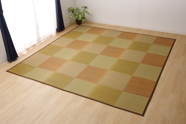市松柄でシンプルなデザインに仕上げたイ草花ござカーペットです。花ござを敷くだけで畳のお部屋をリフレッシュ出来ます。日焼けしてしまった畳のリフレッシュに、新品の畳を汚さない為のカバーにご使用下さい。い草には空気の自然浄化作用、湿度の調節作用などがあり、汚れにくいという特長があります。い草に青森ヒバ加工を施しています(抗菌・防臭効果)。青森県のヒバの木から抽出した「ヒバ油」をメーカー独自の技術で材料や商品に加工しました。「ヒバ油」には、ヒノキチオールという天然物質としては極めて抗菌性の高い成分が含まれ、医療や食品など多分野で利用研究が進められています。※自然素材であること、また職人が一つ一つ手作業にて加工を行うため、形状のバラつきや表示サイズと多少異なることがあります。ご了承下さい。
