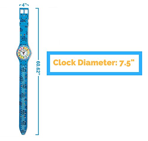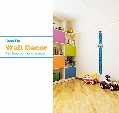 EASY ASSEMBLY AND FUNCTIONALITY This telling time teaching clock and hanging growth chart is simple to put together, with only a few steps and an easy-to-follow manual. The growth chart is engraved in the "bands" of the watch where you or your child can mark growth progress and write dates. The height markings go up to 56" which means your kid can use the chart until they reach about 4 ½ feet in height or about 10 years of age. After that, the clock can remain on the wall as a decorative piece.