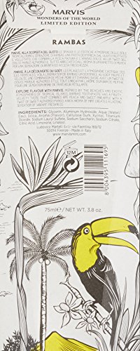 Inspired by the beaches and exotic atmospheres of tropical islands, Marvis RAMBAS toothpaste has a fun, fruity, velvety taste that combines ripe peach and sweet pineapple with a twist of sweet Alphonso mango. A rich aroma of Marvis’ signature mint creates a lasting sensation of vibrant freshness. With the limited edition Wonders of the World collection, Marvis undertakes a series of incredible and adventurous journeys: a trip starting from the Western culture capitals, passing through extreme deserts, till the end of the known world. Straight from Florence, Marvis is a superior dental brand beloved in Italy for generations. Marvis revolutionized the concept of toothpaste, transforming an everyday ritual into something remarkable. Suddenly your morning routine transports you somewhere, leaving you with a long-lasting, pleasurable taste sensation and a healthy mouth. Marvis toothpaste flavors are created by offsetting the aroma of mint, to provide the freshness you need, with innovative notes to offer you a long-lasting, pleasurable taste sensation that can be different every day. The Marvis Formula: white, protected teeth, fresh breath all day long, and aid in preventing tooth decay, tartar and plaque. Fluoride-free, gluten-free, vegan, paraben- and phthalate-free.Feature