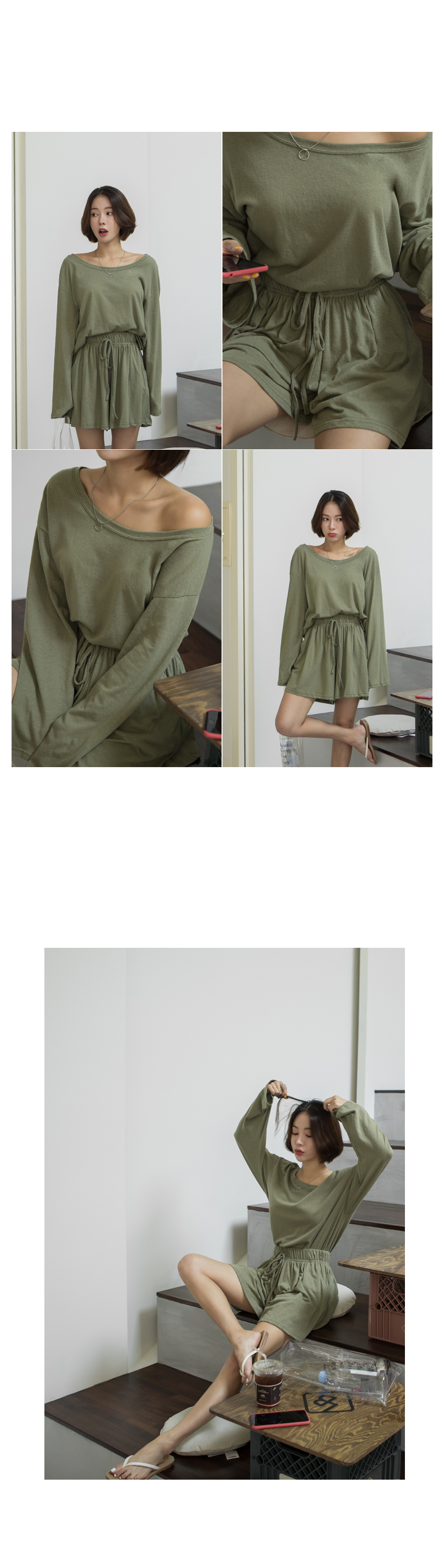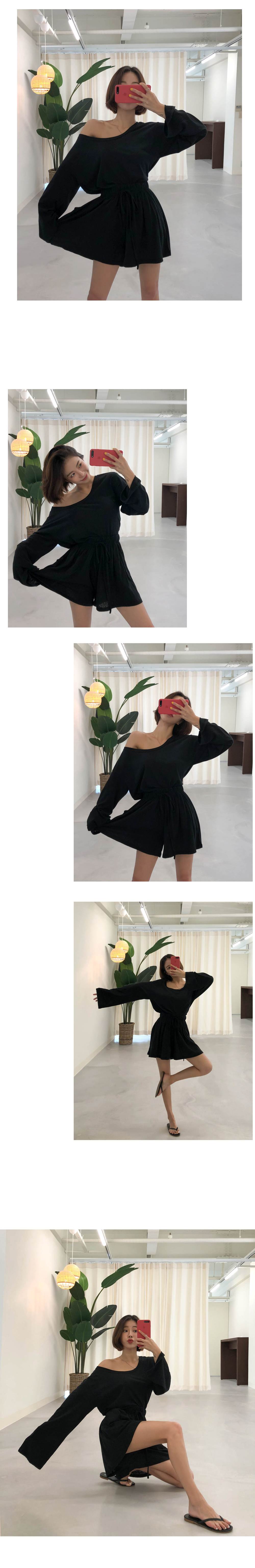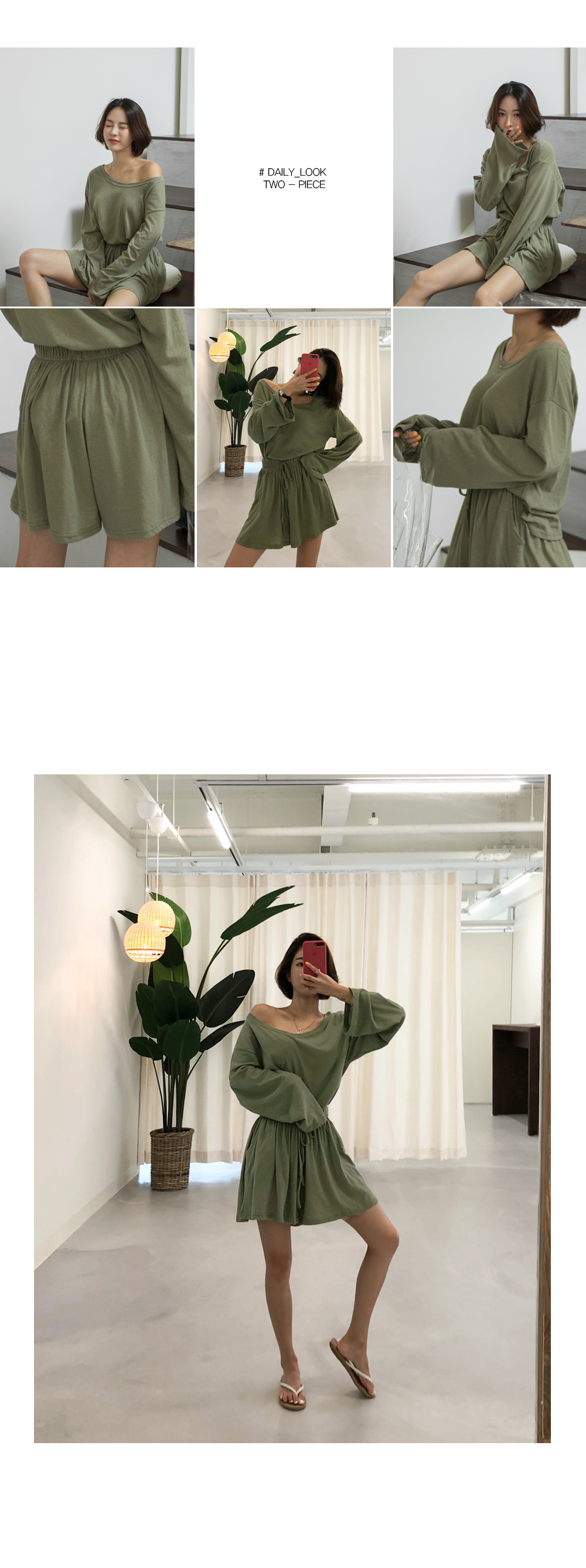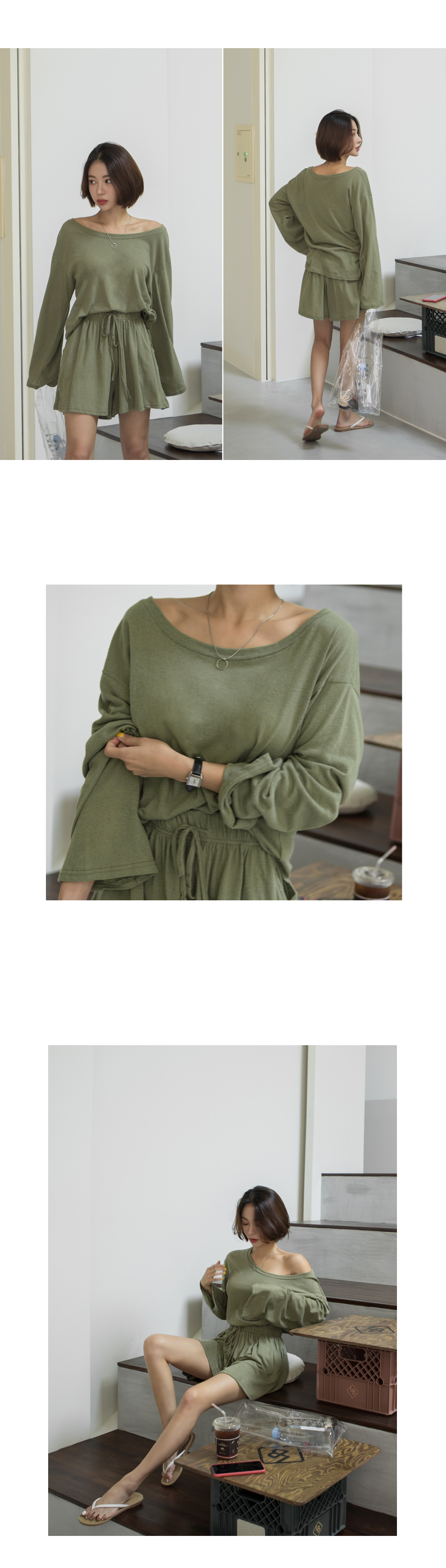 상의는 깊게 파인 보트넥 라인으로 쇄골과 목선이 길고 예뻐보이는 효과를 주구요~
