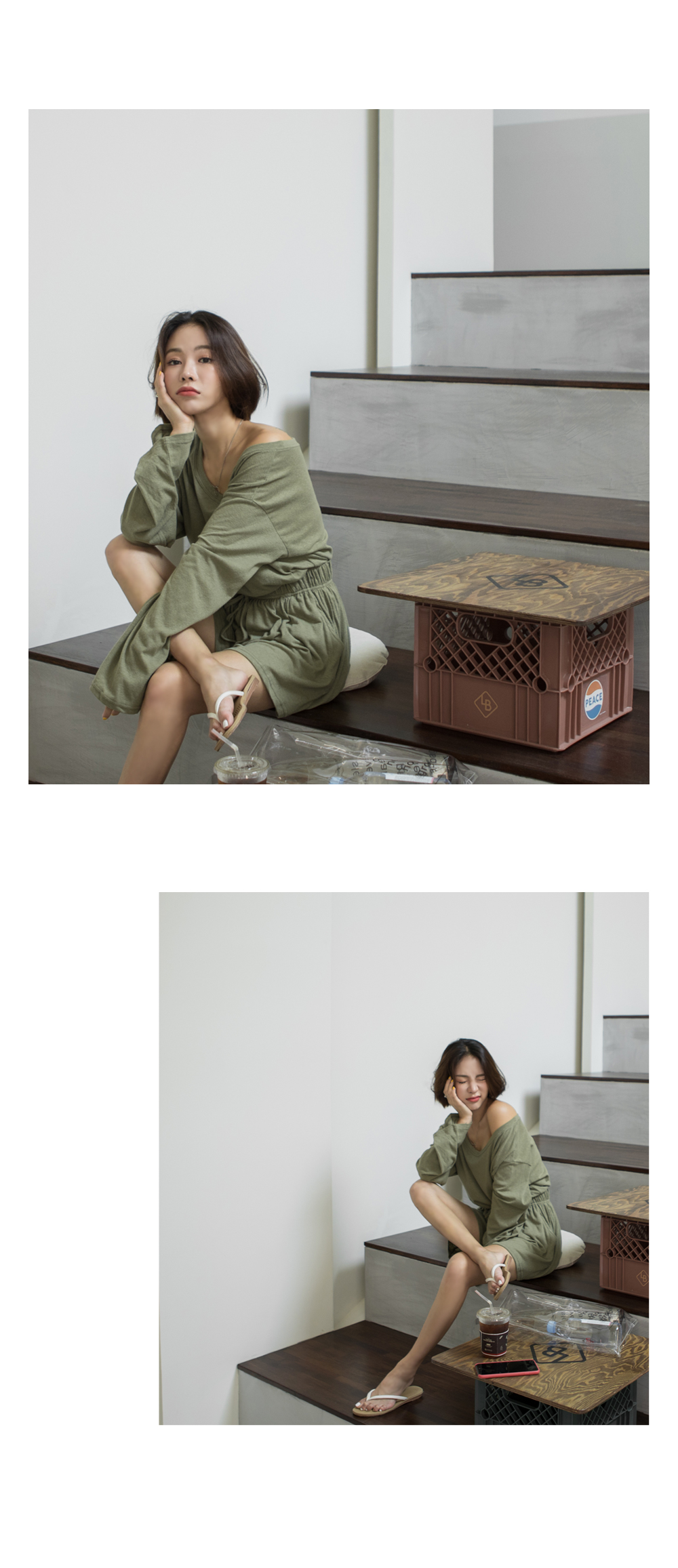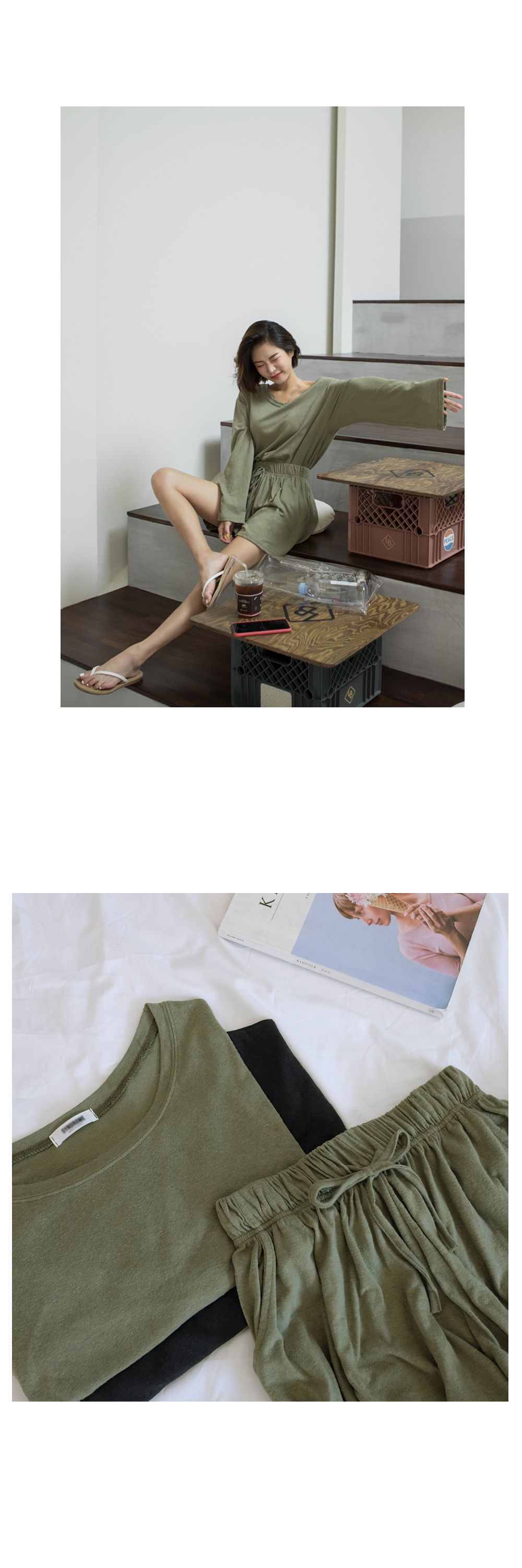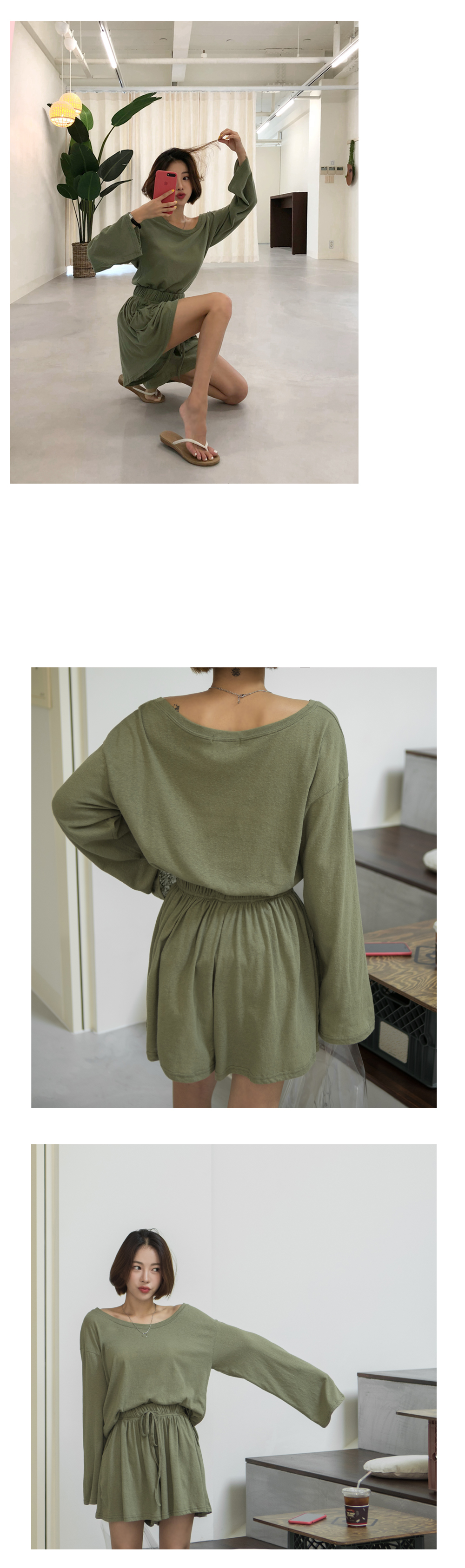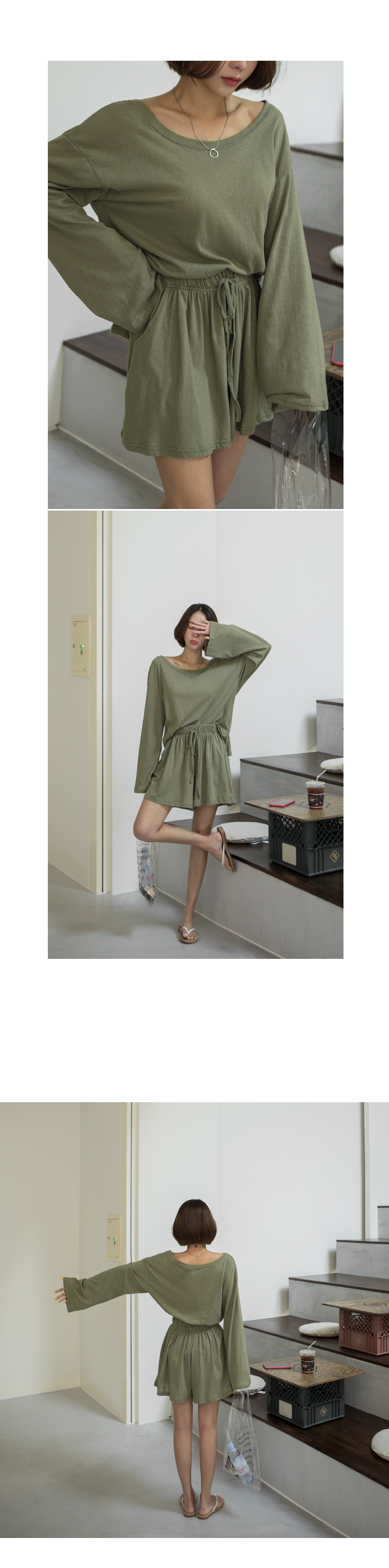 상의는 깊게 파인 보트넥 라인으로 쇄골과 목선이 길고 예뻐보이는 효과를 주구요~