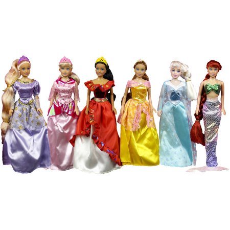 This gift set includes 6 Fairytale inspired Princesses! Each doll is 11 inches tall and comes with her own princess gown. Includes Rapunzel, Aurora, Belle, Linnea (Elsa inspired character doll), Ariel and Adela (Elena inspired character doll).Feature