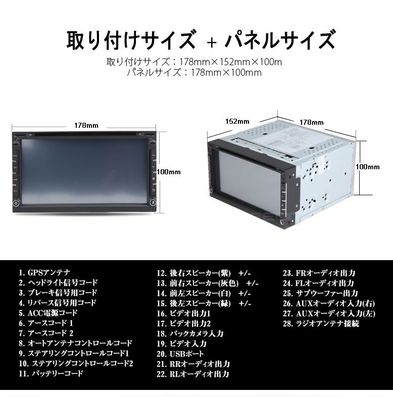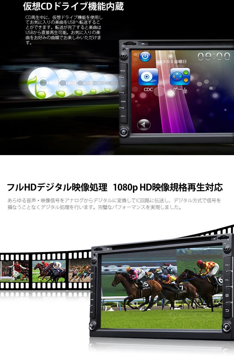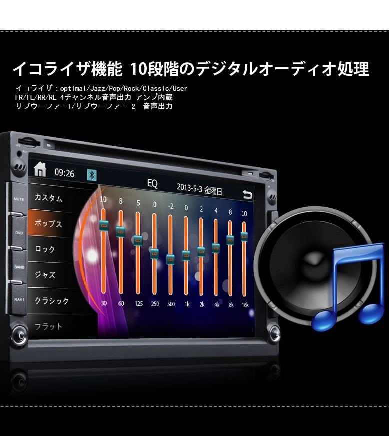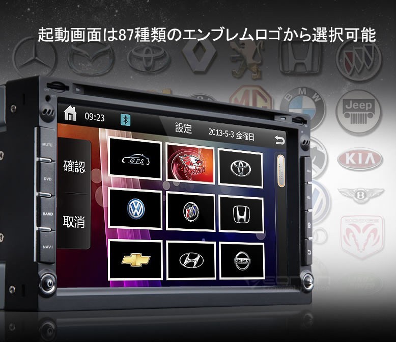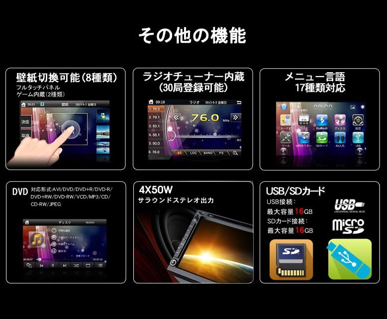 -バックカメラ映像表示:正像/鏡像 -起動画面は87種類のエンブレムロゴから選択可能 -Bluetooth電話帳機能対応-LEDボタンバックライト:ブルー -GPSデュアルゾーン機能 -ステアリングコントロール機能 -ディスプレイ表示ワンタッチON/OFF機能 -壁紙切換可能(8種類)-時計表示機能内蔵 -電源状態記憶機能-USB/Micro SDカードスロット搭載-メニュー言語:日本語/英語/簡体字中国語/繁体字中国語/スペイン語/ポルトガル語/ロシア語/フランス語/イタリア語/ア