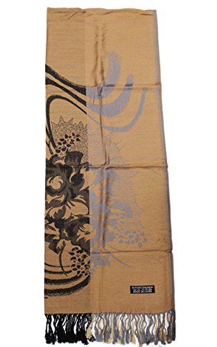 (Pashmina Shawl)/Accessories/Scarves/DIRECT FROM USA/Tan Pashmina Shawl w/Silver Black Floral Swirl Patterns