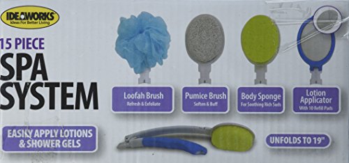 -. Feature : 4 Interchageable heads to scrub, smooth, soften and soothe: / Pamper yourself with silky smooth skin. A unique spa experience. / 15 piece set includes an extra-long reach foldable handle wand, lotion applicator, loofah sponge, pumice brush, body sponge plus ten applicator refill pads.