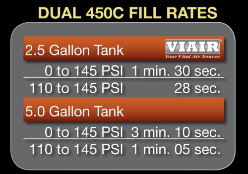 Can fill a 2.5 gallon air tank from 0 to 145PSI in 1 minutes and 30 seconds. Can fill at 5.0 gallon air tank from 0 to 145 PSI in 3 minutes and 10 seconds.