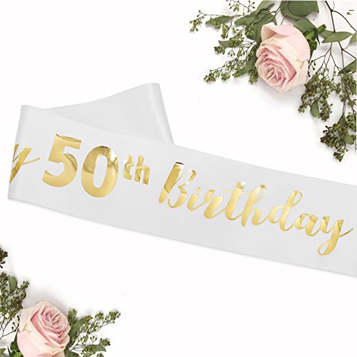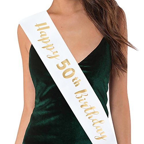 FCAROLYN “Happy 50th Birthday” - White Satin Sash with Gold Lettering - Birthday Girl Sash 50th Birthday Party Supplies
