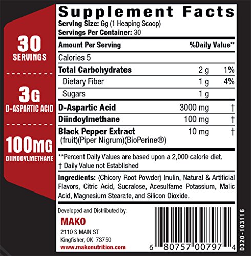 ReleaseDate : 2017-10-01 Studio : 305 VENTURES LLC Publisher : 305 VENTURES LLC Binding : Health and Beauty Product Description MAKO's TESTAMAX Drink Powder is a great natural Testosterone Support supplement. It is simple and to the point with 3 active ingredients: D-ASPARTIC ACID - One serving provides fully dosed 3.12 grams level, indicated in clinical studies to support natural testosterone levels and support Luteinizing Hormone production, DIM - DIINDOLYMETHANE is sourced from cruciferous vegetables like cauliflower and kale, and is suggested to support metabolism of estrogen, and Black Pepper Extract to help with absorption. 0