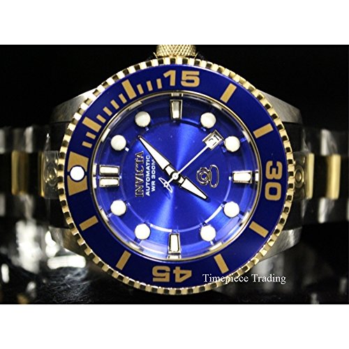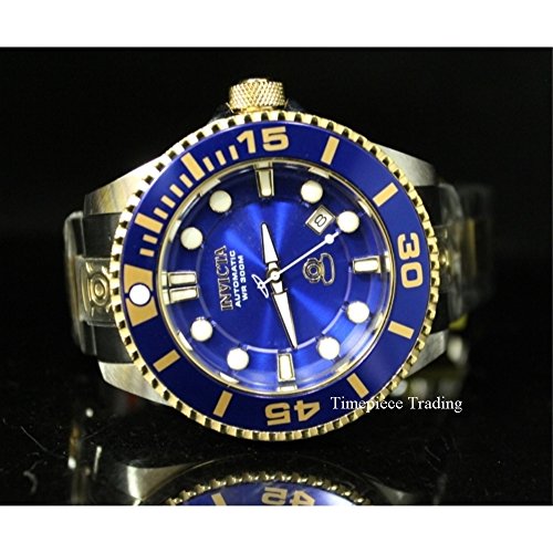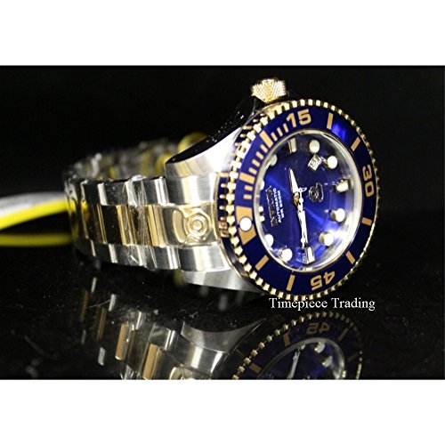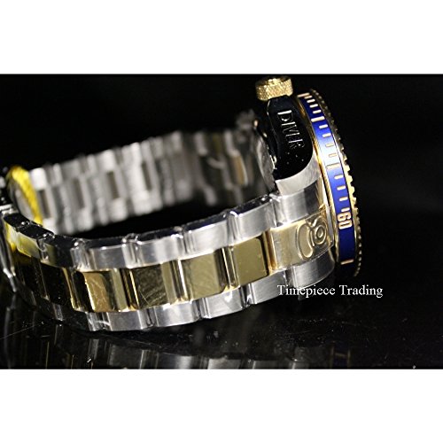 300m; Precise 24 Jewels Japanese Automatic Movement; Date Window Between 4:00 and 5:00; Unidirectional 18k Gold IP Stainless Steel Bezel with Blue Top Ring and Blue Rim; Screw-Down 18k Gold IP Crown
