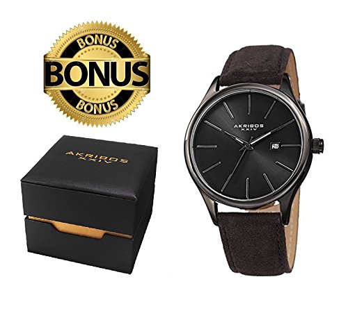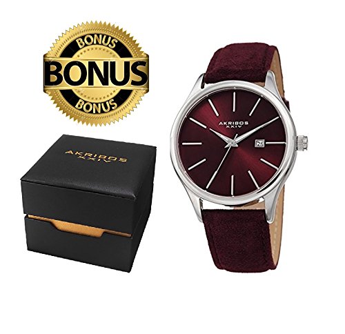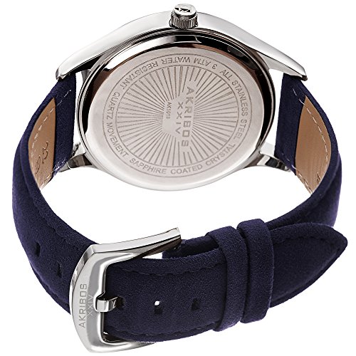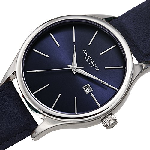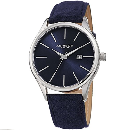 This classically designed Akribos timepiece features a bold polished case with a blue radiant sunray dial. The minimalistic timekeeping is accentuated by the hand-applied stick markers, giving it a sleek, stylish presence on the wrist. Powering it is a precision quartz movement, and a blue suede-covered genuine leather strap completes its stylish appearance.