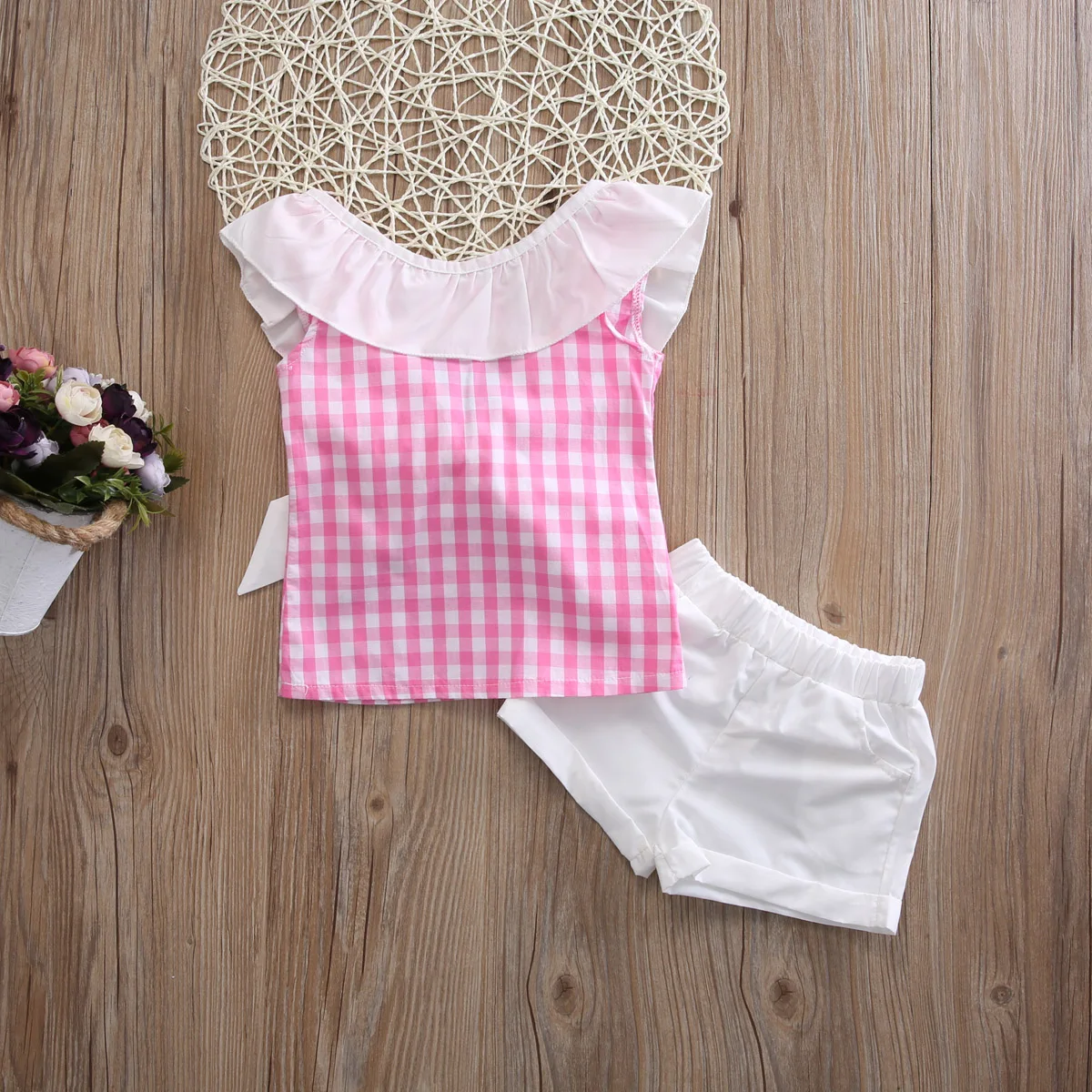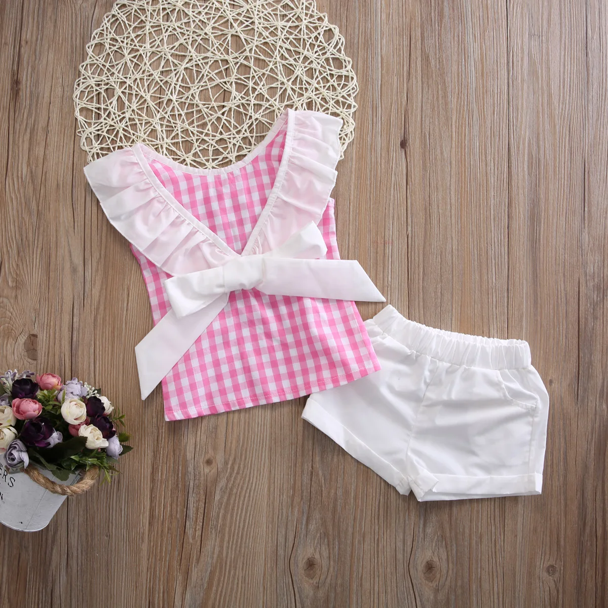 On Stock Children Toddler Kids Girls Set Bow Plaid T-shirt + Pants Outfits 2Pcs Set Clothes 2-7Y Child Summer Clothes Set