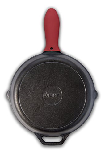 Red Silicone Handle Holder While cooking with a cast iron skillet makes food taste great, grabbing the hot handle can make you quickly forget about the good stuff at the end. That’s why this Cuisinel cast iron skillet comes complete with a heat-resistant handle cover that makes it easier to transition between stove, oven, grill or open fire without burning your hand.