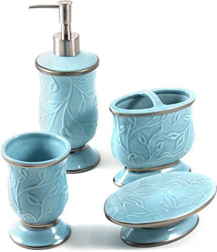 -. Feature : Seafoam blue ceramic construction / Includes a bathroom tumbler, toothbrush holder, soap dispenser, and soap dish / Raised leaves design / Silver trim / Hand washing recommended