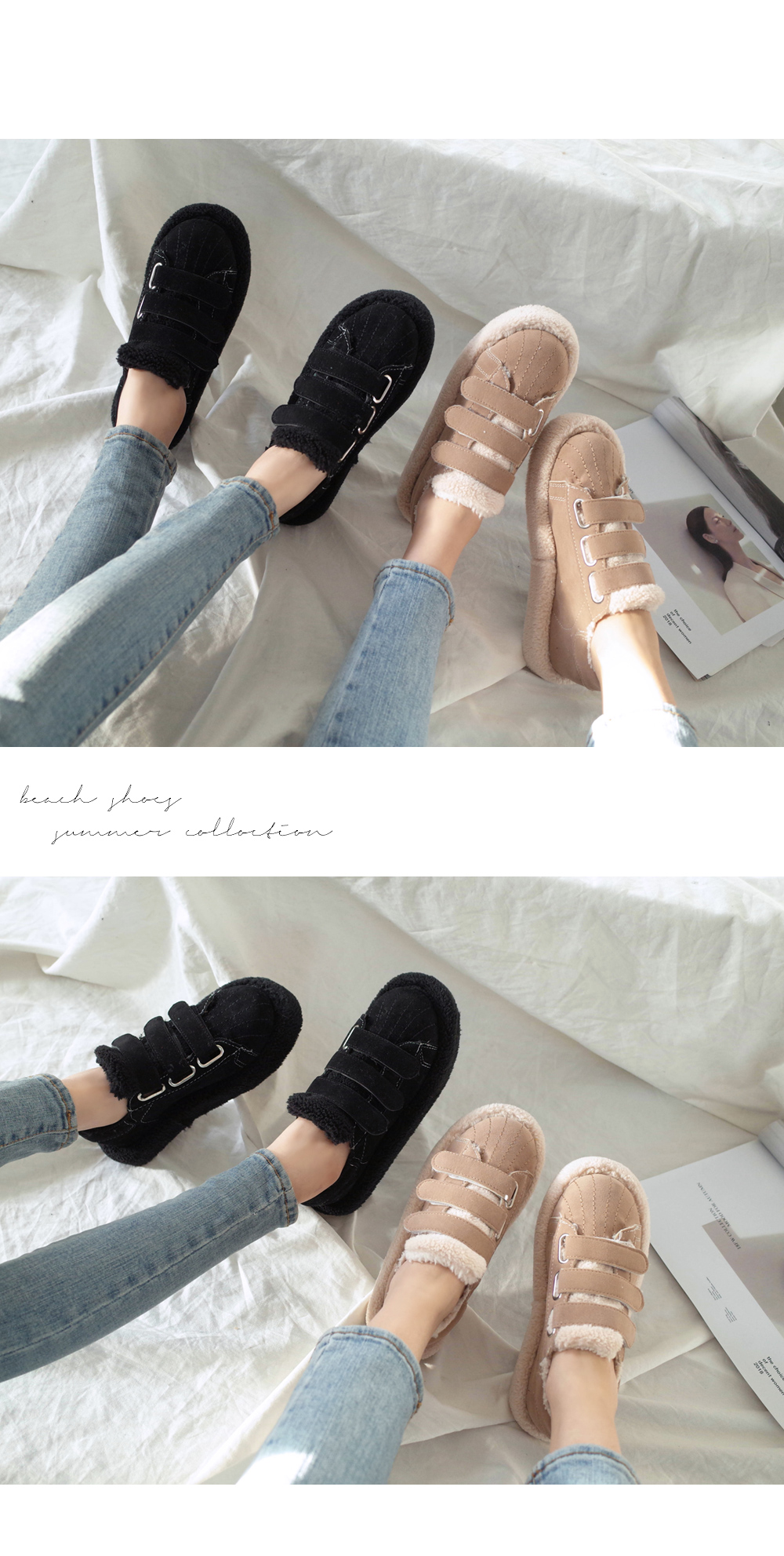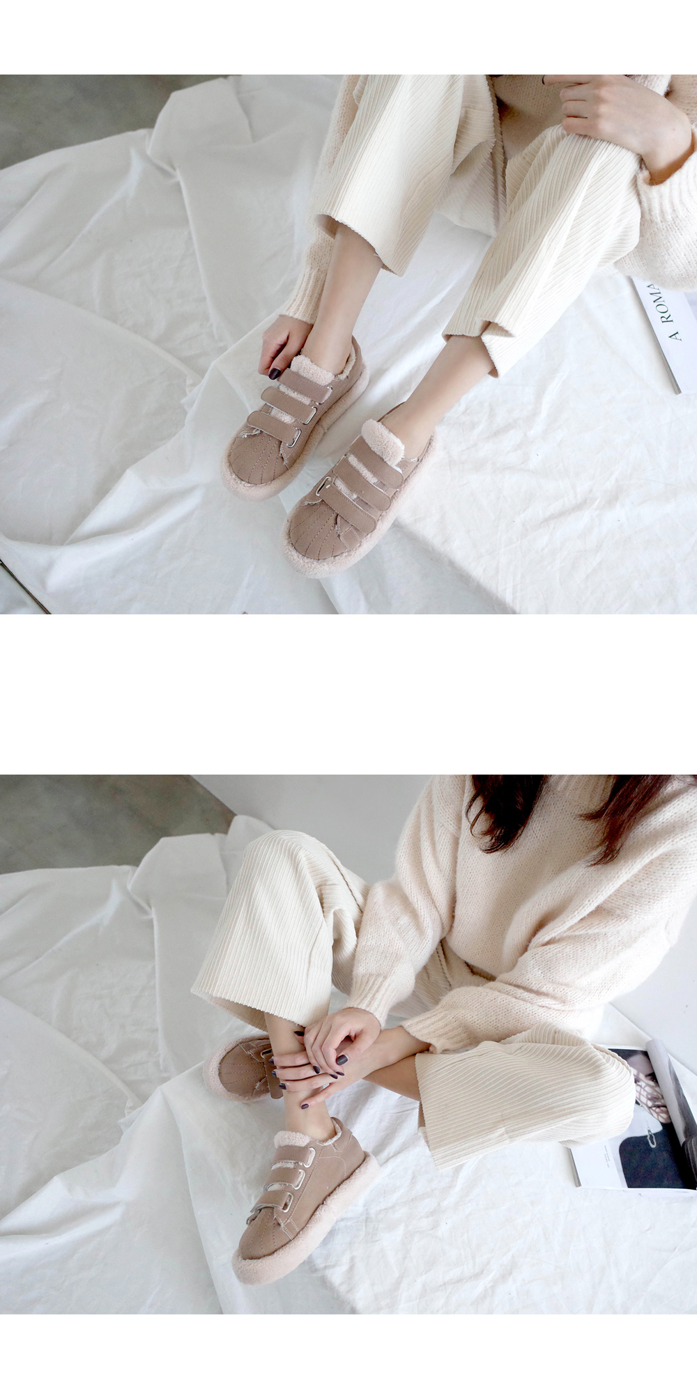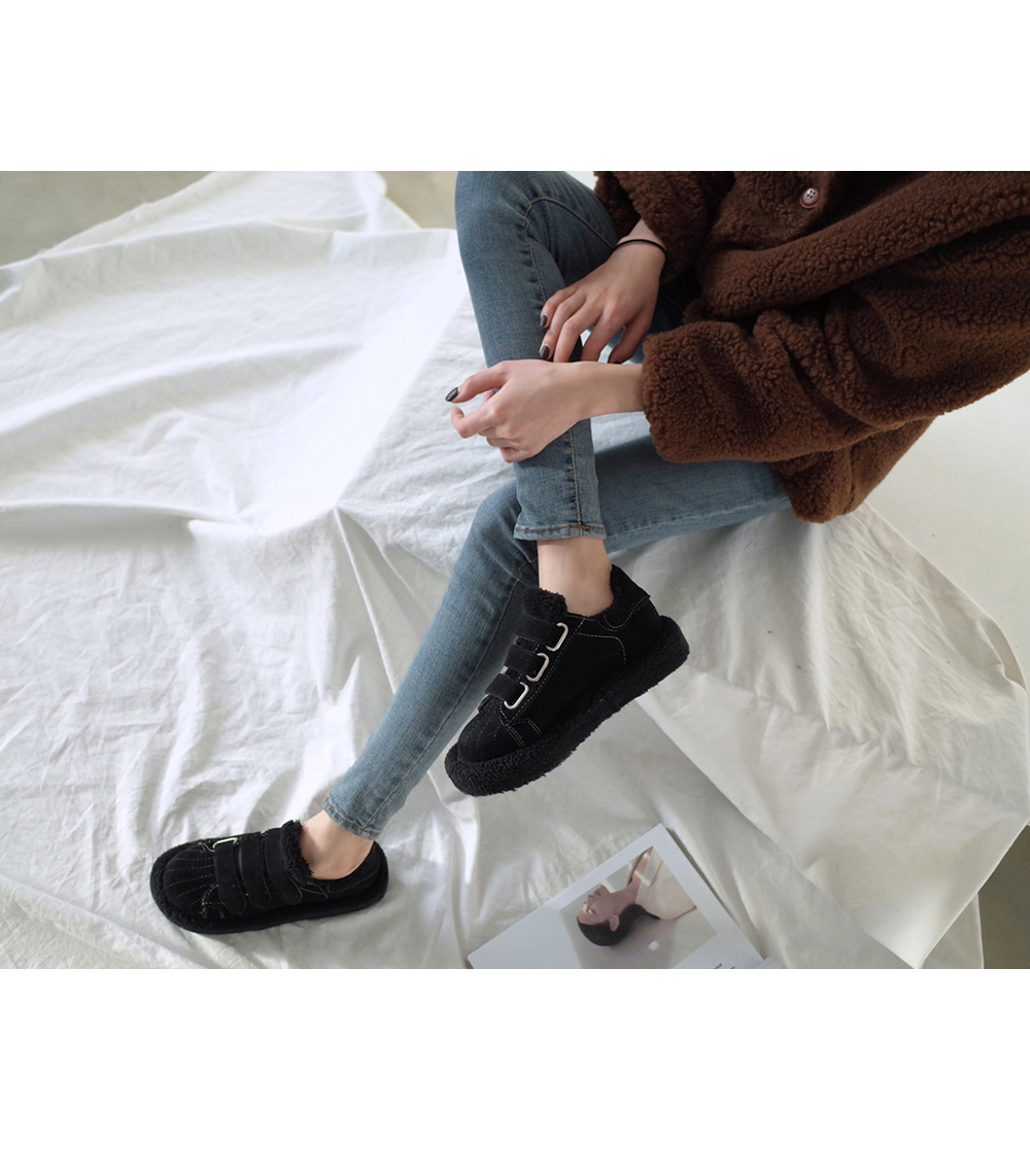 DETAILS - 소재 : 인조스웨이드 인조퍼 - 안감 : 옆면 바닥 털 안감 - 컬러 : beige,black - 피팅감 : 정사이즈 / 무게 : 보통인편 - 착화감 : 편해서 데일리 슈즈로 좋아요 - 모델피팅 : 235(37)