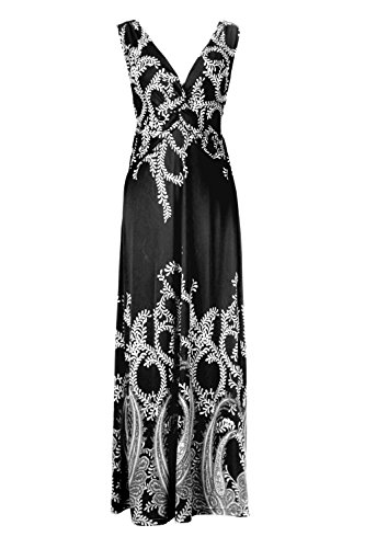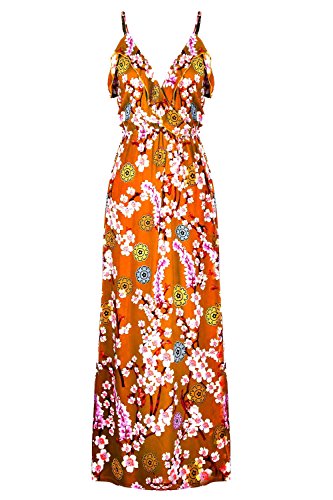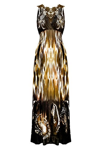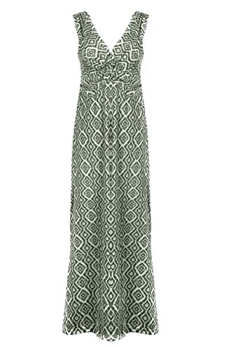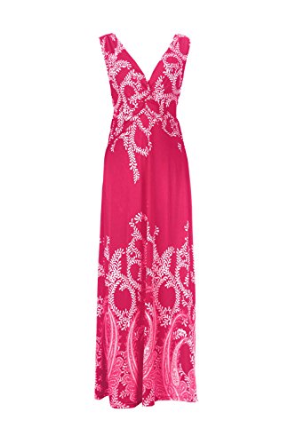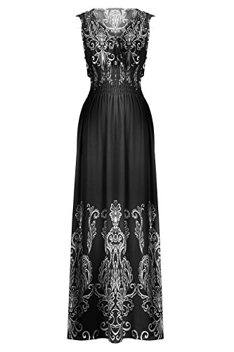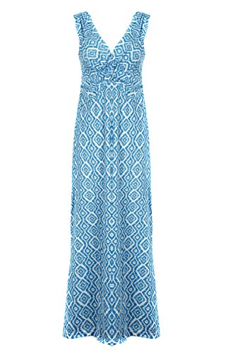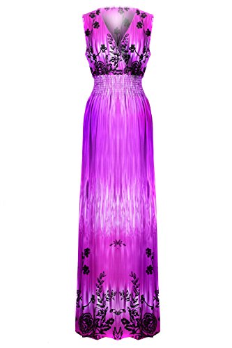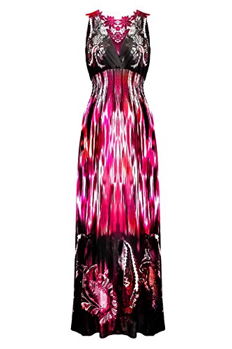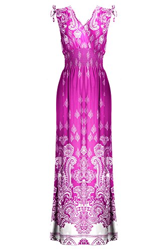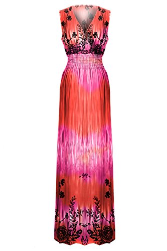 Sleeveless long smocked dress featuring a bohemian inspired bright bold printed pattern all throughout for the spring summer season. Surplice crossover v-neckline and a fitted smocked stretch construction accenuating the waistline. Ruched tie and smocked details at shoulders and a lengthy dress in a top quality medium weight jersey stretch knit for softness and comfort.Feature