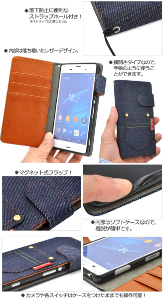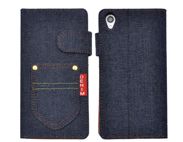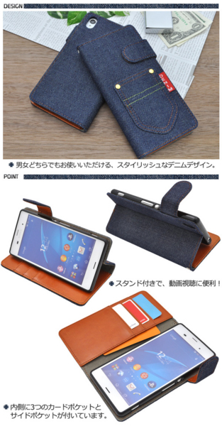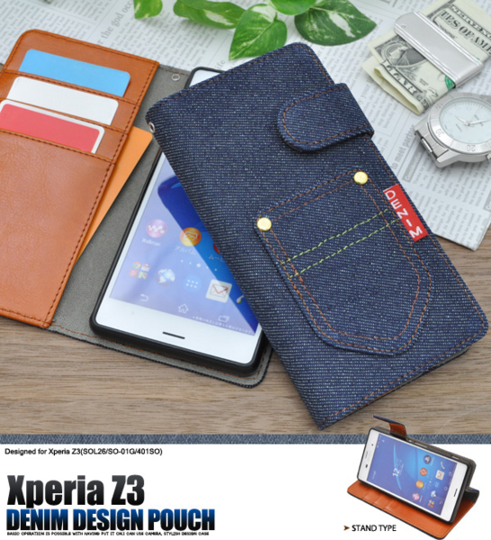 デニムデザインのXperia Z3用スタンドケースポーチ。