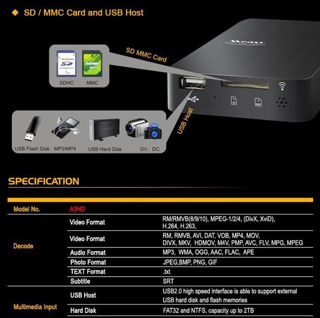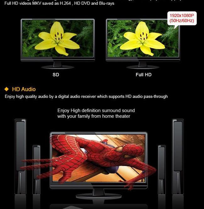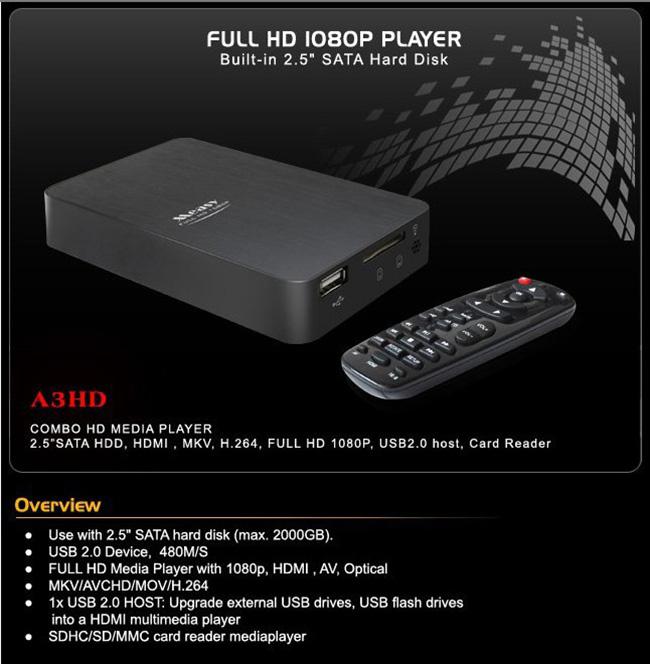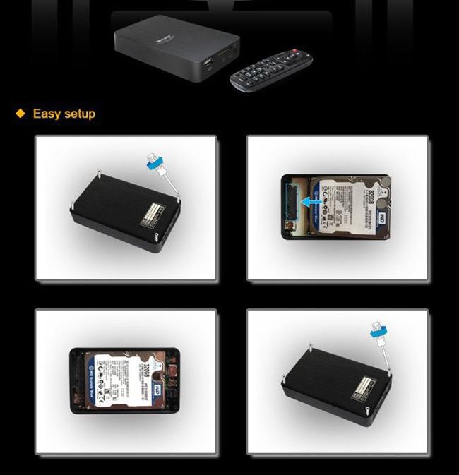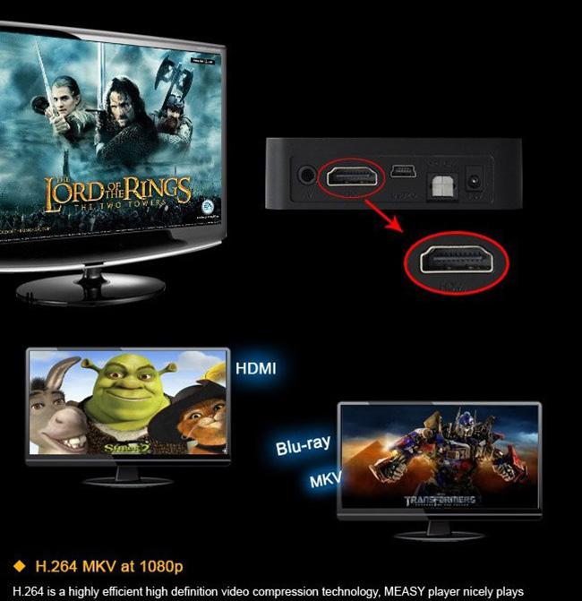 Unlike many other media players on the market the Measy A3HD HD Media Player has a built-in hard drive bay that allowing you to install a SATA 2.5" HDD up to 2TB! Now you can save all your favorite movies, precious family movies, irreplaceable pictures and music. You may also connect an external HDD or a pen Drive to this unit This unit comes with an HDMI cable to connect to your TV, and if you connect this to a suitable Home Theatre system, you can watch movies having 5:1 audio channels and a full HD1080, thus replicating a Movie Theatre at home.