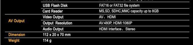 * Audio Output:HDMI Interface,Stereo * Interface:USB Host,MS/SDHC/MMC Card Slot