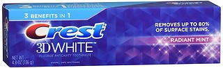 -. Binding : Misc. -. Brand : Crest -. EAN : 0037000947769 -. Feature : Removes up to 80% of surface stains for a noticeably whiter smile in just 14 days / Micro-cleansing whiteners coat your teeth to loosen surface stains / Unique formula creates a foaming action that helps polish them away to gently whiten teeth / Gel paste hybrid formula refreshes with a cool blast of mint -. IsAdultProduct : 0 -. Label : Crest -. Manufacturer : Crest -. Model : Cre-6077 -. MPN : 122726 -. NumberOfItems : 6 -. PackageQuantity : 6 -. PartNumber : 122726 -. ProductGroup : Beauty -. ProductTypeName : HEALTH_PERSONAL_CARE -. Publisher : Crest -. Studio : Crest -. Title : Crest 3D White Toothpaste Radiant Mint 4.8 oz (6 pack) -. UPC : 037000947769