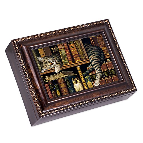 SLEEPING CAT DARK BURL WOOD FINISH WITH GOLD TRIM JEWELRY MUSIC BOX - PLAYS TUNE PACHELBEL'S CANON IN D