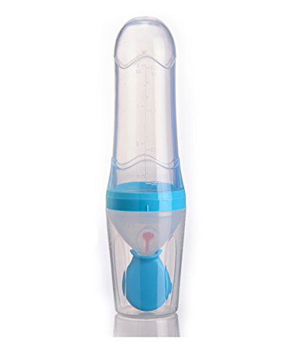 GRyiyi Temperature sensing Baby Feeding Bottle with Baby Food Dispensing Spoon Attached Silicone Squeeze Feeder 4.05 Ounce, Blue