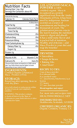 - Feature : Powerful superfood: Healthworks USDA Certified Organic Gelantinized Maca Root Powder has been used for thousands of years as a powerful addition to a healthy diet. Our Gelatinized Maca is easier to digest and very soluble. / Easy to use: A versatile addition to many snacks and meals! Maca can be added to smoothies and juices as well as soups, energy bars, oatmeal, baked goods and even cereal! / Beneficial nutrients: Healthworks Maca Root Powder is high in Protein, Fiber, Vitamin C, B Vitamins, Calcium, Iron, Potassium, Copper, Manganese and Fatty Acids. / Healthworks partners with small farmers right from the source to ensure a product that meets our sustainable standards. / Healthworks 100% Satisfaction Promise: Get a full refund or replacement within 30 days if you are not completely satisfied