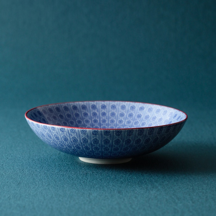 네이비의 꽃무늬에 빨강의 라인이 포인트가 된 식탁을 즐겁게 하게 해 주는 평작은 접시입니다.