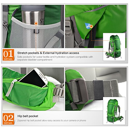 -. Feature : -BOTTOM COMPARTMENT- Zippered access. It comes with an internal zippered divider. / -8 COMPRESSION STRAPS- For tying up your pack or hanging sleeping bag, tent, hammock, and other gears. Elastic bands on them can keep the extra strap from dangling all around the pack. / -HYDRATION SYSTEM COMPATIBLE- Hydration access on a side of the pack with water bladder sleeve in the main compartment. / -YKK BRAND ACCESSORIES- YKK zippers and YKK buckles. / -WARRANTY- Includes 90 days limited manufacturer's warranty