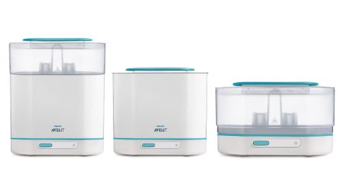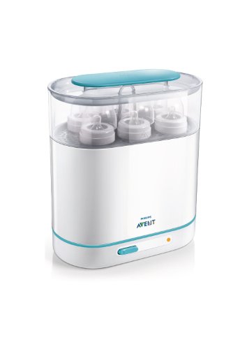 Philips AVENT 3-in-1 Classic Electric Steam Sterilizer effectively eliminates 99.9 percent of bacteria from your baby's feeding items in just minutes. It holds up to six Classic bottles, yet it takes only minimal space in your kitchen. Advanced features, such as a six-minute cycle with automatic shutoff, make it easy to sterilize breast pumps, bottles, cups, and more.Feature