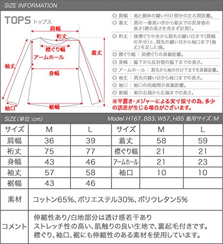 -. Feature : 素材 コットン65%、ポリエステル3%、ポリウレタン5%コメント伸縮性あり/白地部分は透け感若干ありストレッチ性の高い、肌触りの良い生地で、裏起毛付きです。襟ぐり、袖口、裾にも伸縮性のある / サイズ 【M】肩幅:36cm 着丈:58cm 裄丈:75cm 襟ぐり幅:21cm 身幅:43cm アームホール:21cm 袖丈:57cm 袖口:1cm 裾幅:43cm【L】肩幅:39cm 着丈:59cm 裄丈:77cm 襟ぐり幅:21cm 身幅:46cm アームホール:23cm 袖丈:58cm 袖口:1cm 裾幅:46cm