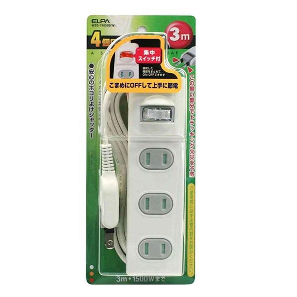 集中スイッチ付ですので、プラグを抜かずに使用機器を一斉にON/OFFできます。 製造国:中国 仕様:■定格:AC125V 15A■合計1500Wまで■使用温度範囲:-10度~40度■屋内専用 ※サプライヤー直送品 ご注文後3~4営業日後の出荷となります【商品名】ELPA(エルパ) 扉付タップ 集中スイッチ付 3m 4個口 ホワイト WBS-T4030B(W)