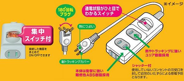 集中スイッチ付ですので、プラグを抜かずに使用機器を一斉にON/OFFできます。