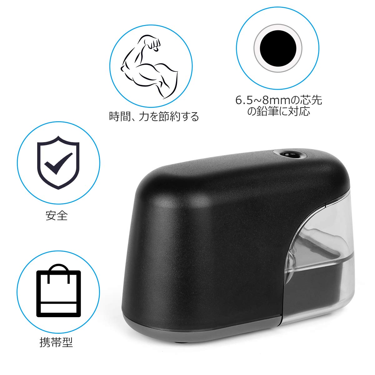 【電池式&自動鉛筆削り】:乾電池を4本使用の電動式鉛筆削り(電池は含めない、バッテリーは自分で購入してください)コンパクトなサイズで、使う場所を問わず室内、屋外で使い分けができるのは持ち運べ便利です。ご注意:替刃の交換のために、削り内蔵部品刃は取り外し可能です。だから、 鉛筆を引き出す時、削りの刃はゆるめるかもしれません。この時、電動削りは壊れません。刃を再び取り付けて使用できます。取り付け方法:指で刀の切れお握って少し上向きに押すと、刀の切れが抜ける。