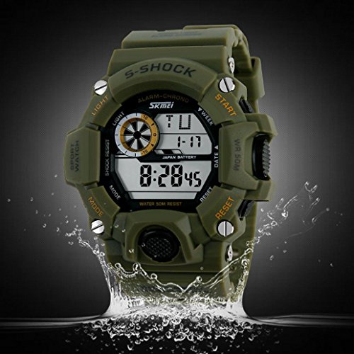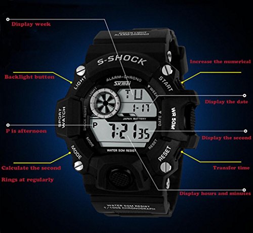 -. Feature : 【本体サイズ】ケース直径(リューズ含まず):50mm;ケース厚み:15mm。バンド長さ(ケース含め):260mm;バンド幅:26mm。本体重量:65g。豊富なカラーバリエーション:全7種類。 / 【素 材】ケース素材:ステンレス・スチール;ベゼル素材:合成樹脂;バンド素材:シリコン;風防素材:樹脂ガラス。 ★頑丈なケース、ステンレス・スチールで作って、摩滅に耐え、それとも、锖防止の功能もあります。★ベルトには、水や汗などに強く耐久性の高いシリコンを採用しています。シリコンを使用することによりカジュアルなイメージも与えるとともに、軽量で腕への負担も軽減できます。 / 【多機能SPORT WATCH】安心の日常生活用強化防水仕様。(水中の任意のボタンを押さないでください。)時間、曜日と日付のLEDディスプレイ; ELバックライト; アラームと時報; 12/24Hフォーマットオプション; オートカレンダー; 1/100秒クロノグラフ; ストップウォッチ。 / 【見やすい表示(LCD表示)】洗練された大きい文字盤デザイン。視認性抜群のスタンダードデジタルウォッチ。精度の高いクオーツムーブメントが正確な時を刻みます。ランニング、サイクリング、クライミング、ジョギング、キャンプ、ゴルフなどのような屋外と屋内スポーツに最適です。Goenn腕時計はあらゆる場面にふさわしいもので、人気のメンズクォーツ腕時計です。 / 【セット内容】腕時計本体*1のみ。省エネ、長寿命で、長く使用できるバッテリーを搭載。ファッションなフェイスで飽きのこないスタンダードな腕時計です。お仕事でもプライベートでもご使用可能。類似商品なら、どうぞ、Goenn Storeへ~ご注文になるとき、何か問い合わせることがありましたら、こちらにご連絡くださいませ。